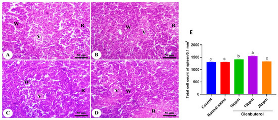 Photomicrograph of spleen of control (A) and clenbuterol treated groups of chickens; (B) clenbuterol 10 ppm, (C) clenbuterol 15 ppm and (D) clenbuterol 20 ppm showing white pulp (W) surrounding an artery (V) and loosely arranged blood sinusoids forming the red pulp (R). Stain H&E, scale bar = 50 µm. (E) morphometric analysis of total cell count of splenic parenchyma. Columns with differ superscripts (a, b, c, d) differ significantly (p < 0.05).