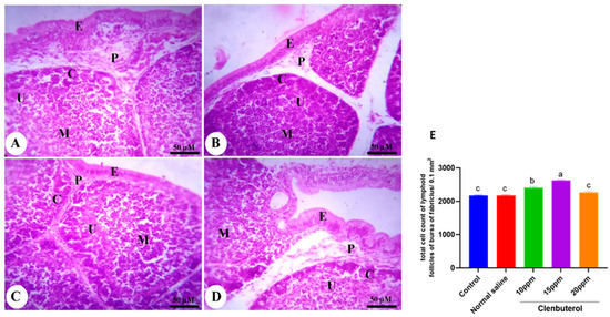 Photomicrograph of the bursa of Fabricius of control (A) and clenbuterol treated groups of chickens; (B) clenbuterol 10 ppm, (C) clenbuterol 15 ppm and (D) clenbuterol 20 ppm showing pseudostratified columnar epithelium (E), lamina propria (P), cortex (C) and medulla (M) of lymphoid follicle separated by undifferentiated cell layer (U). Stain H&E, scale bar = 50µm. E. morphometric analysis of total cell count of lymphoid follicles of the bursa of Fabricius. Columns with differ superscripts (a, b, c, d) differ significantly (p < 0.05).