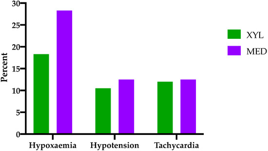 The occurrence of hypoxaemia, hypotension, and tachycardia is shown in Figure 1. In 18 horses, no arterial blood gas samples were available; hence, judgment of oxygenation was made on the basis of pulse oximetry. In three instances of group MED, neither arterial blood gas samples nor pulse oximetry values were available. In group MED, 13.3% of the cases were classified as hypoxaemic, and 14.7% were classified as mildly hypoxaemic. In group XYL, 6.8% were hypoxaemic, and 11.5% were mildly hypoxaemic. In six horses (XYL 3; MED 3), blood pressure was measured non-invasively, and, in five horses (XYL 2; MED 3), no blood pressure values were available. Hypotension was observed in 10.5% of the horses receiving xylazine and in 12.5% of the horses receiving medetomidine. Duration of hypotension did not significantly deviate between both groups (XYL 20 (15–100); MED 30 (15–190) min; p = 0.29). With regard to tachycardia, both groups showed similar occurrence (XYL 12%; MED 12.5%) and duration (XYL 30 (5–150); MED 35 (5–215) min; p = 0.73). Duration of anaesthesia was significantly longer in group MED compared to group XYL (155 (34–300) and 140 (45–375) min, respectively; p = 0.008).