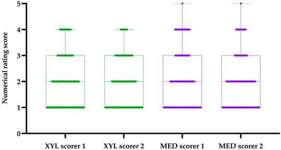 Distribution of recovery scores attributed by two independent and blinded observers (scorer 1 and scorer 2) on the basis of video recordings using a numerical rating score (1–5; 1 = smooth recovery in one attempt, 5 = recovery resulting in injury) for recoveries following xylazine partial intravenous anaesthesia (PVIA) (XYL, green) or medetomidine PIVA (MED, purple) with isoflurane. The bold horizontal lines represent the frequency of scores for each scorer and each group; the boxes imply the median, 5th–95th percentiles, and range of scores.