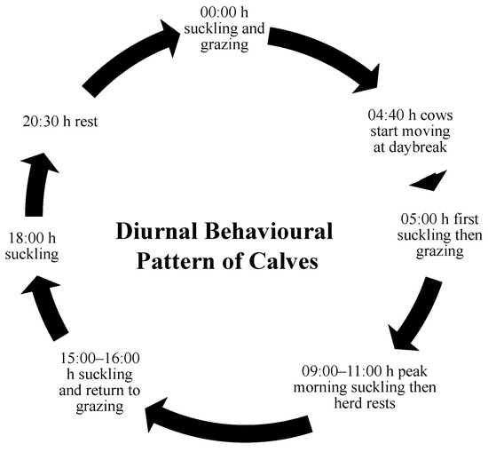 Cow–calf contact systems in natural settings (i.e., zebu, beef, Maremma on pasture or rangeland) appear to follow a consistent suckling pattern that occurs during behavioural transitions. Across several studies, calves were observed to suckle their mothers at dawn, mid-morning, mid-afternoon, evening, and again at midnight (Figure 1). More recent work found that suckling peaked at sunrise, just after noon (13:00–14:00 h), afternoon (15:00–16:00 h) and at night (22:00–23:00 h); however, the beef cattle in this study were housed in a barn likely limiting their activity [64]. At dawn, cows begin moving, and within 35 min, calves suckle for the first time that day [45,49,77]. Calves remain close to their mothers, grazing before suckling again mid-morning [43]. At this point, the herd often moves to find water and a resting place where they lie down for most of the early afternoon [13,43,78]. As the animals transition back to grazing mid-afternoon, calves will again suckle [13,43,49]. Calves usually engage in their final suckling bout when the herd transitions to resting at dusk [43,45,77]. There are a few studies that indicate that this pattern changes as calves age, with the introduction of grazing and a suckling event near midnight [43,77].