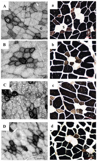 Four slides were prepared per muscle sample, and 3 images from each slide with the greatest muscle fiber integrity were obtained for histological parameters. Fiber type was classified according to the following criteria: for NADH-TR technique (Figure 1A–D), dark fibers were identified as oxidative (O) and light fibers as glycolytic (G); and with alkaline ATPase technique (Figure 1a–d), light fibers were identified as slow (S, type I), dark fibers as intermediate (I, type IIb), and brown fibers as fast (F, type IIx/ IId).