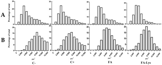 Cross-sectional area distribution patterns of muscle fibers (NADH-TR). (A) Oxidative fibers and (B) glycolytic fibers. Treatments: negative control treatment (C−), without additive; positive control treatment (C+), 10 ppm/kg of feed of ractopamine hydrochloride + 0.97% lysine; FA treatment, 25 ppm/kg of feed of FA; and FA-Lys treatment, 25 ppm/kg of feed of FA + 0.97% lysine.