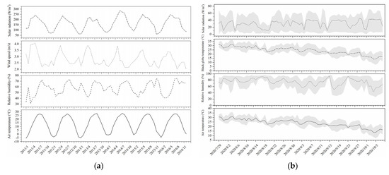 (a) Monthly variations in the average values of the outdoor environmental factors of the measured region (2011–2016) and (b) daily variations in the average values of the environmental factors inside the barns over the study period. The black line indicates the average value. The grey region indicates the maximum and minimum values.