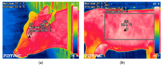 Animal measures were conducted twice daily: in the morning (0800–1200 h) and in the afternoon (1400–1800 h). Rectal temperature (RT) was measured using a veterinary digital thermometer (ShangNong Technology Inc., Qingdao, Shandong, China; accuracy of ± 0.1 °C from 35 to 39 °C). Respiration rate (RR) was measured by counting the flank movements for 60 s. Skin temperature (ST) and eye temperature (ET) were measured using a Fotric 235 infrared thermography (FOTRIC Inc., Jingan, Shanghai, China; resolution of 336 × 252 pixels; accuracy of ±2.0 °C from −20 to 150 °C). The infrared images were analyzed using AnalyzIR software (Fortic Inc., Jingan, Shanghai, China). The methods for the measurements of ST and ET using infrared thermography agreed with those from previous studies [26,27]. The Ta and RH corresponding to the time when the image was taken were inputted into the software to adjust for these variables on the camera accuracy. The emissivity was set to 0.97. Typical examples of the regions used to obtain temperature variables are shown in Figure 2. By using the shape-drawing tool, a box was placed on the trunk to obtain the ST variable, and an oval was placed on the eye to obtain the ET variable. According to the recommendations from Hoffmann et al. [23], only the maximum temperature of the region was considered in the statistical analysis. The results of the animal-based indicators during this study are shown in Table 2.