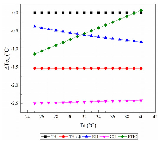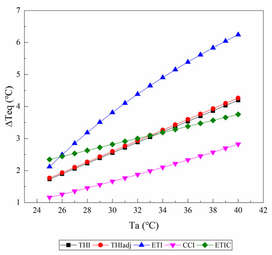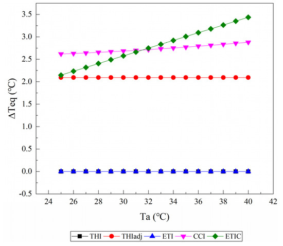 Figure 5 shows the changes of the ΔTeq values caused by an increase in solar radiation from 100 W/m2 to 500 W/m2 at a wind speed of 0.2 m/s and a relative humidity of 50%. THI1 and ETI did not include the parameter of solar radiation, and thus, their ΔTeq values were equal to zero. Other TIs (i.e., THIadj, CCI, and ETIC) treated an increase in solar sr as a warming effect. For the THIadj, the ΔTeq values were constant at approximately 2.1 °C. The ΔTeq values obtained from the ETIC decreased with when the Ta increased, while those obtained from the CCI decreased as the Ta increased at a comparatively slower rate.