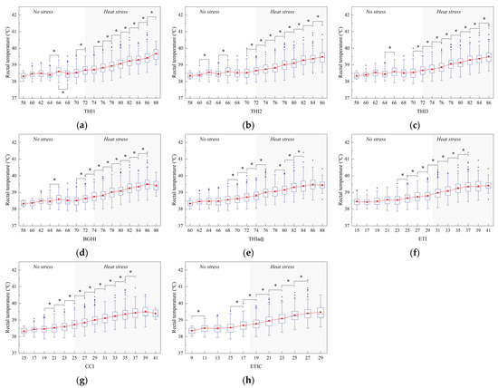 Effect of the thermal index values on rectal temperature. The interquartile range (IQR) is shown by a blue box, the median as a blue horizontal line, the mean as a red square, and the whiskers extend to 1.5 IQR. Outliers are indicated by blue dots. An asterisk indicates a significant (p < 0.05) change in the variable. The thermal indices are the temperature–humidity index (THI1 (a), THI2 (b), THI3 (c)), black globe humidity index (BGHI (d)), adjusted THI (THIadj (e)), equivalent temperature index (ETI (f)), comprehensive climate index (CCI (g)), and equivalent temperature index for dairy cattle (ETIC (h)).