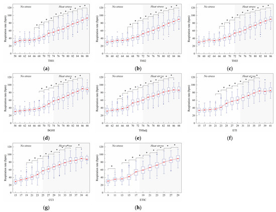 Effect of the thermal index values on respiration rate. The interquartile range (IQR) is shown by a blue box, the median as a blue horizontal line, the mean as a red square, and the whiskers extend to 1.5 IQR. Outliers are indicated by blue dots. An asterisk indicates a significant (p < 0.05) change in the variable. The thermal indices are temperature–humidity index (THI1 (a), THI2 (b), THI3 (c)), black globe humidity index (BGHI (d)), adjusted THI (THIadj (e)), equivalent temperature index (ETI (f)), comprehensive climate index (CCI (g)), and equivalent temperature index for dairy cattle (ETIC (h)).