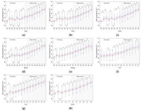 Effect of the thermal index values on skin temperature. The interquartile range (IQR) is shown by a blue box, the median as a blue horizontal line, the mean as a red square, and the whiskers extend to 1.5 IQR. Outliers are indicated by blue dots. An asterisk indicates a significant (p < 0.05) change in the variable. The thermal indices are the temperature–humidity index (THI1 (a), THI2 (b), THI3 (c)), black globe humidity index (BGHI (d)), adjusted THI (THIadj (e)), equivalent temperature index (ETI (f)), comprehensive climate index (CCI (g)), and equivalent temperature index for dairy cattle (ETIC (h)).