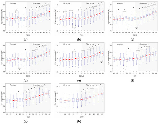 Effect of the thermal index values on eye temperature. The interquartile range (IQR) is shown by a blue box, the median as a blue horizontal line, the mean as a red square, and the whiskers extend to 1.5 IQR. Outliers are indicated by blue dots. An asterisk indicates a significant (p < 0.05) change in the variable. The thermal indices are the temperature–humidity index (THI1 (a), THI2 (b), THI3 (c)), black globe humidity index (BGHI (d)), adjusted THI (THIadj (e)), equivalent temperature index (ETI (f)), comprehensive climate index (CCI (g)), and equivalent temperature index for dairy cattle (ETIC (h)).