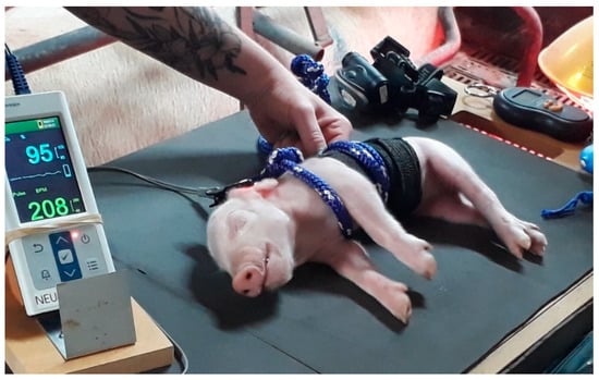 Seventeen healthy Large White X Landrace piglets were selected between 12 and 36 h old, using the inclusion criteria described below. Piglets were selected from litters of 12 or fewer to reduce the likelihood of applying the squeeze to individuals with underlying pathophysiological impairment, such as placental insufficiency or intrapartum hypoxaemia, which are more common in larger litters [,,]. Within the litter, piglets that appeared to be the most vigorous (e.g., showing behaviours such as walking, teat seeking and sucking milk) were chosen. Piglets that were small, apparently weak or had abnormal conformation (e.g., protruding forehead, shorter snout, leg deformities) were rejected to avoid any confounding impacts of underlying health problems [].