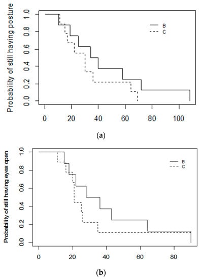 The piglets for which the squeeze was discontinued due to high intensity arousals initially lost posture as quickly as the piglets that stayed less responsive for the full 10 min (Cat. B: Median = 37 s, Range = 10–108; Cat. C: Med = 30 s, Range = 11–69; log-rank p = 0.30); however, the time to loss of posture was less variable in the Category C piglets (Figure 3a). In contrast, the Category B piglets appeared to take longer to close their eyes and to cease moving than the Category C piglets did. However, statistical tests suggest the difference was not significant for this study population (Latency to close eyes: Cat. B: Med = 32 s, Range = 15–90; Cat. C: Med = 21 s, Range = 11–90; log-rank p = 0.30; Latency to cease moving: Cat. B: Med = 58.5 s, Range = 22–108; Cat. C: Med = 32 s, Range = 12–129; log-rank p = 0.40) (Figure 3a,b).