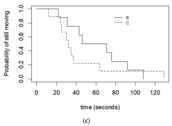 Kaplan–Meier graphs of (a) Latency to lose posture, (b) Latency to close eyes, (c) Latency to cease moving in 17 piglets that were successfully induced into a less-responsive state with either the cuff or the rope, and that did not have the squeeze discontinued for health reasons. Category C piglets (n = 9) maintained a less-responsive state for the full 10 min squeeze period, whereas the squeeze was discontinued in Category B piglets (n = 7).