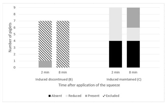 Pedal reflexes of Category B (induced discontinued, n = 7) and Category C (induced maintained, n = 9) piglets at 2 and 8 min after application of a thoracic squeeze. One piglet that was discontinued for physiological instability (Category D) is not included in the graph. Palpebral reflexes were similar with minor differences in responses for two piglets. Based on their similarities, only pedal reflexes are shown in the graph.