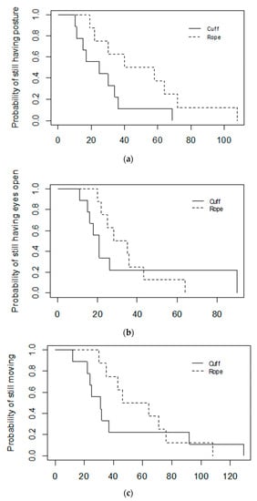 Kaplan–Meier graphs of (a) Latency to lose posture, (b) Latency to close eyes, (c) Latency to cease moving in 17 piglets that were successfully induced into a less-responsive state with either the cuff (n = 9) or the rope (n = 8).
