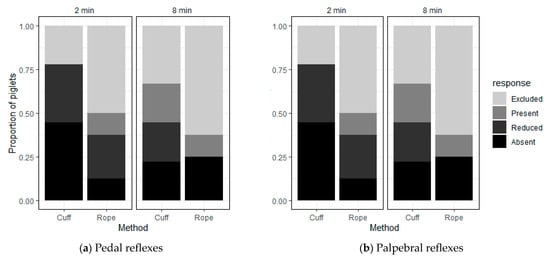 Number of piglets exhibiting each level of (a) Pedal reflex responses and (b) Palpebral reflex responses at 2 and 8 min after application of the thoracic squeeze for each method of application. ‘Excluded’ refers to piglets that did not have their reflexes tested because of low intensity arousals that preceded a discontinuation of the squeeze soon after the testing point or because the squeeze had already been discontinued. ‘Present’ refers to a full limb withdrawal or blink of the eye; ‘Reduced’ refers to a slight limb withdrawal or twitch of the eye; ‘Absent’ refers to no limb or eye responses to reflex testing.