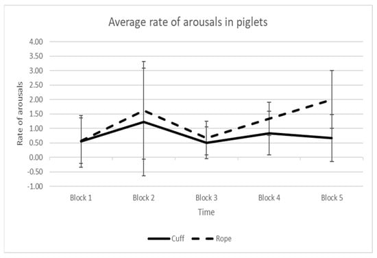 Average (±SD) rate of low intensity arousals during successive 2 min intervals during the full observation period for piglets squeezed with the cuff or rope. The duration of Block 1 varied among individual piglets depending on how long it took for the piglet to be induced, while all other blocks were 2 min long. The number of piglets in each time block decreased from 17 piglets in Block 1 to 9 piglets in Blocks 3, 4 and 5 (n = 3 Rope, n = 6 Cuff) as the squeeze was discontinued for some piglets.