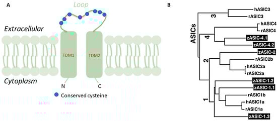 (A) Schematic view of one ASIC subunit: Each subunit has two hydrophobic transmembrane domains, a large cysteine-rich extracellular loop, and short intracellular N- and C- termini; (B) phylogenetic tree illustrating the relationship of zASICs and other ASICs from human (h) and rat (r) (Paukert et al., 2004 modified).