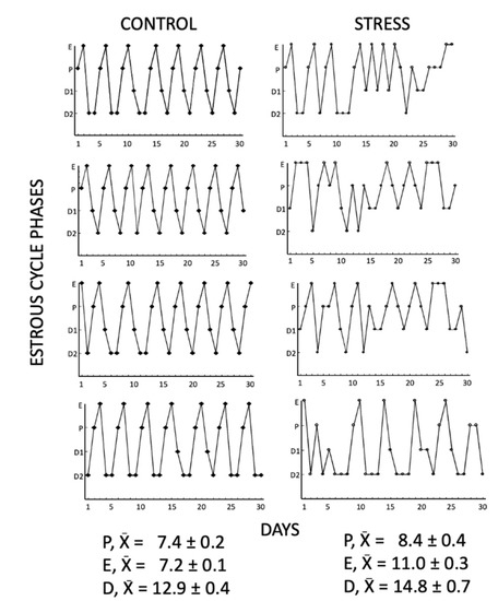 Representative estrous cycles of 4 control and 4 stressed females for 30 days. Chronic stress caused irregular and prolonged estrous cycles, increasing the number of consecutive days (3) in proestrus, estrus, and diestrus compared to control females. E= estrus, P = proestrus, D1= diestrus 1, D2 = diestrus 2.