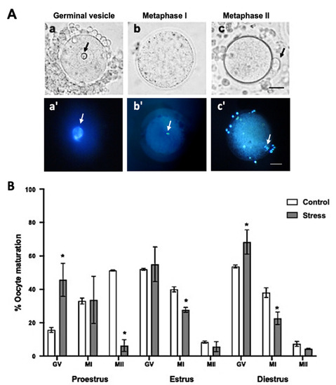 Oocyte maturation stages depending on the estrous cycle phases in control and stressed adult female rats. (A) Representative images of oocyte maturation stages with bright field (a–c) and Hoechst stain (a’–c’) evaluation: (a,a’) germinal vesicle (GV), the arrows indicate nucleolus, (b,b’) metaphase I (MI), the arrows indicate the metaphase and (c,c’) metaphase II (MII), the arrows indicate first polar body. Scale bar = 30 µm. (B) Percentage of oocyte maturation depending on the estrous cycle phases in control and stressed female rats. The percentage of GV oocytes increased in stressed females in the proestrus and diestrus phases. MI oocytes decreased in stress females in estrus and diestrus. Oocyte maturation (MII-stage) decreased in stressed females in proestrus. Data are shown as Mean ± SEM. * Significant difference vs. control when p < 0.05. The total number of evaluated oocytes was proestrus (control n = 185; stress n = 191), estrus (control n = 48; stress n = 46), and diestrus (control n = 147; stress n = 144).