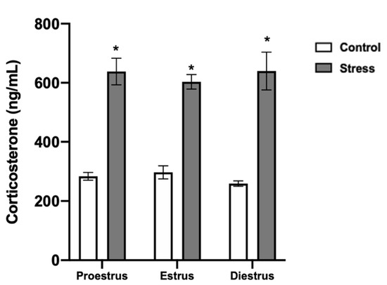 Corticosterone serum levels in control and stressed females. Corticosterone increased in stressed females in all estrous cycle phases. Data are shown as Mean ± SEM. * Significant difference vs. control when p < 0.05. Proestrus (n = 15), estrus (n = 15), and diestrus (n = 15).