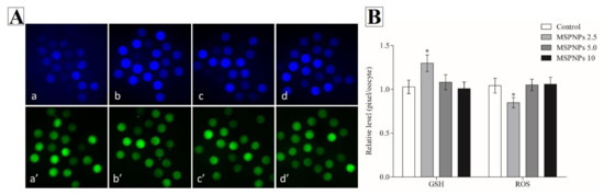Evaluation of glutathione and reactive oxygen species of in vitro matured porcine oocytes at different concentrations of MSPNPs. (A) Oocytes were stained with (a–d) Cell Tracker Blue and (a’–d’) 2′,7′-dichlorodihydrofluorescein diacetate (H2DCFDA) to detect intracellular levels of glutathione (GSH) and reactive oxygen species (ROS), respectively, whereas (a,a’) control and (b,b’) MSPNPs-2.5, (c,c’) MSPNPs-5.0, and (d,d’) MSPNPs-10 matured oocytes. (B) Effects on intracellular levels of GSH and ROS in vitro matured porcine oocytes. * Indicates that there is a significant difference in the GSH and ROS levels between each group (p < 0.05). GSH samples, n = 60; ROS samples, n = 60. The experiment was independently replicated three times.