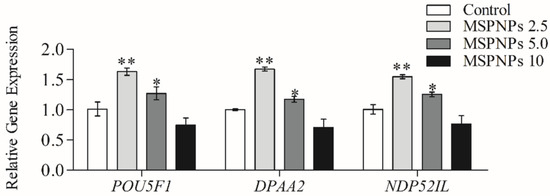 Relative expression of POU5F1, DPPA2, and NDP52 mRNA transcripts in cloned blastocysts obtained from oocytes supplemented with varying concentrations of MSmPNPs (0, 2.5, 5.0, and 10 µg/mL) in maturation media. Each sample consisted of five blastocysts and three times replicate. * Indicates that there is a significant difference in mRNA values between each group (p < 0.05). ** Indicates that there is a significant difference in mRNA values at p < 0.01.