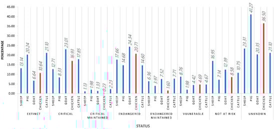 As can be inferred from these numbers, indigenous or local breeds represent most of the worldwide poultry genetic diversity. These breeds are classified depending on whether they are registered in a single country (native), in several countries in the same region (regional cross-border), or several regions (international cross-border). The percentages for each of these categories may vary considerably from region to region []. As suggested in Figure 1, population data are frequently missing (36.50% unknown status), making risk assessment extremely difficult. The lack of data is a consequence of the difficulties that the monitoring of small livestock populations involves as a direct consequence of the weak attention that most governments generally pay to poultry despite their pivotal roles in livestock food security, rural livelihoods, and gender equity [,].