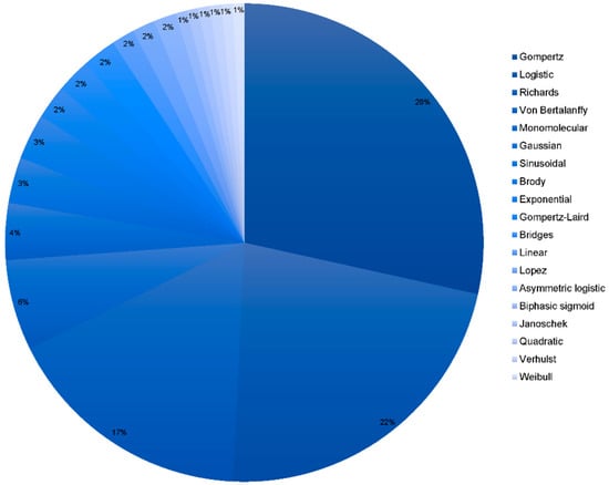 In the last few years, authors have tried to reduce the models and even produce certain variations in each of them so that they fit specific biological curves []. Additionally, the development of some flexibility criteria, such as corrected Akaike’s information (AICc) or BIC, have been aimed at penalizing models with a high number of parameters in their formula [].