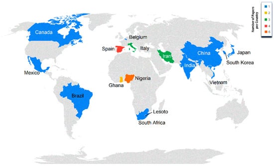 Figure 3 presents the distribution of studies across countries, with Nigeria (in Africa) and Spain, and Italy (in Europe) being the most active countries in terms of research publications basing upon the study of local populations. A very strong association was reported between the impact factor, quartile, and database of the journal and the continent or country where the study was carried out (p < 0.001). When working with native breeds, there are a large number of limitations regarding the availability of animals and even infrastructures where the research is carried out, due to the low budget that local breeds have in many countries compared to the economic resources that are conferred to rather productive commercial strains [,]. Institutional support is necessary to develop investigation studies in relation to local breeds. Hybrid commercial strains and other foreign breeds have the financing of big poultry multinational integrators based in countries such as China or the USA (countries sharing genetic connections based upon historical market relationships) which also translates into higher scientific attention being paid to them []. All in all, even if a balance of the territorial distribution of growth studies of local breeds across the different continents is shown (Figure 3), not all countries will manage to obtain data of sufficient quality as to be of interest for the most elite journals.
