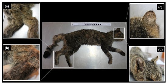 Physical aspect of the dead female European wildcat and most relevant macroscopic alterations reported during the necropsy. (a) Thickening of both tarsal joints. (b) Detail of hyperkeratosis of the left proximal tarsus. (c) Thickening and crusting in right pinnae. (d) Loss of hair density in the rostral plane.