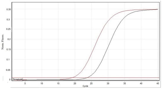 Result of the Taqman real-time PCR for Sarcoptes scabei var. canis; black = positive control, grey = negative control, red = skin sample from the European wildcat.