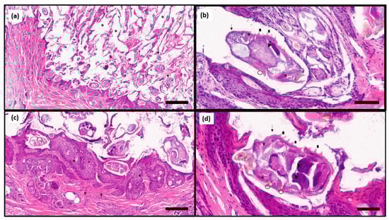 (a): The stratum corneum is expanded by an up to 4 mm thick layer of parakeratotic hyperkeratosis embedding numerous tunnels (three of them are marked with asterisks) that contain many cross and tangential sections of arthropods (two of them are marked with black arrows) Barr = 600 µm. (b,d): Arthropods (black arrows) are approximately 250 × 150 µm in size, have a thick chitinous exoskeleton, dorsal spines (black squares), a hemocoel, striated muscle (asterisks), jointed appendages (circles) and digestive and reproductive organs (arrow heads). Numerous eggs with a tan shell obliterated with basophilic globular material are visible. Barr = 60 and 80 µm, respectively. (c): Associated with the parasites, the superficial dermis is diffusely expanded by moderate numbers of perivascular to interstitial neutrophils, macrophages, eosinophils, fewer lymphocytes and plasma cells (arrow). The epidermis is moderately hyperplastic (asterisk). Barr = 200 µm. H&E stain.