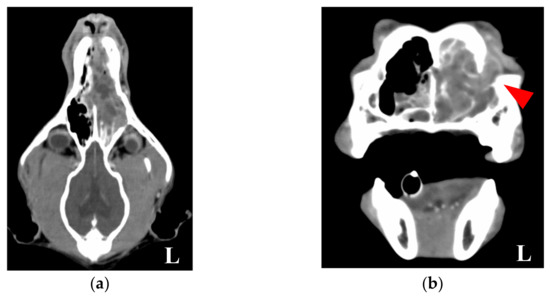 A 10 year old, 17.7 kg, spayed female Shikoku Inu (Japanese native breed) was referred to the Okayama University of Science Veterinary Teaching Hospital for a 1-month history of intermittent left-sided epistaxis. Physical examination was unremarkable, except for a small amount of left-sided epistaxis. A complete blood count revealed mild anemia, but the chemistry and coagulation panels were within normal limits. Thoracic radiographic findings were unremarkable, except for a cave-in to the ventral sternum from the right-lateral view. Whole-body computed tomography (CT) was performed using a 16-slice multidetector CT scanner (Aquilion Lightning, Canon Medical Systems, Otawara, Japan) under general anesthesia. Transverse images of the head and chest were acquired before and after intravenous administration of 2 mL/kg iopamidol (Oypalomin 300, Fuji Pharma Co., Ltd., Tokyo, Japan). There was a large, expansile, mild contrast-enhancing soft-tissue attenuating mass occupying the left nasal cavity (Figure 1a). This mass extended caudally to the level of the cribriform plate and ventrally within the ventral nasal meatus to the level of the choana. Partial lysis of the nasal septum was observed, and the left nasal mass invaded the right nasal cavity. In addition, lysis of the lacrimal bone and mild invasion of the mass in the left orbit were observed (Figure 1b).