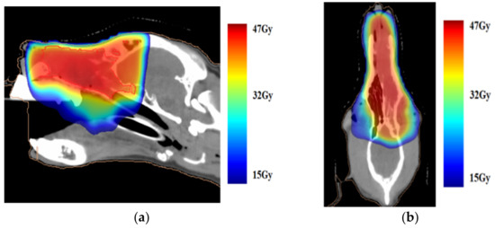 (a) Sagittal and (b) horizontal images prior to radiation therapy overlayed with the dose color wash. The whole nasal cavity is reserved for a total dose of 47 Gy.