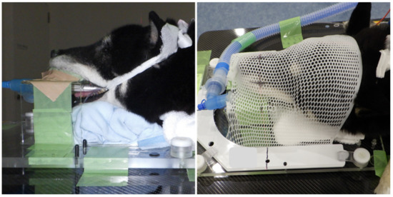 The patient was positioned in ventral recumbency using immobilization devices, including an inflatable matless (Vac-LokTM Cushion, Toyo Medic, Tokyo, Japan), a custom-made thermoplastic face mask, a baseplate (Uniframe ®, Toyo Medic, Tokyo, Japan), and bite block (Express TM impression material, 3M Japan, Tokyo, Japan) (Figure 3).
