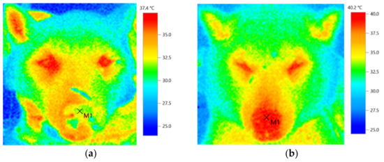 Thermography is a technique for measuring the temperatures of objects remotely and representing said temperature results through images. It is a non-invasive and safe method for detecting changes in surface temperature [1,2,3]. In dogs, thermography is primarily used to identify inflammation, determine stress, or assess diseases that have thermal effects [4,5].