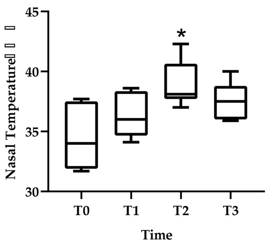 Changes in nasal planum temperature are shown before RT (T0), 30–120 min after RT (T1), 121–240 min after RT (T2), and 241–360 min after RT (T3). Thermal image data are presented as mean ± standard deviation (SD). * Indicates statistical significance (T0 vs. T2).