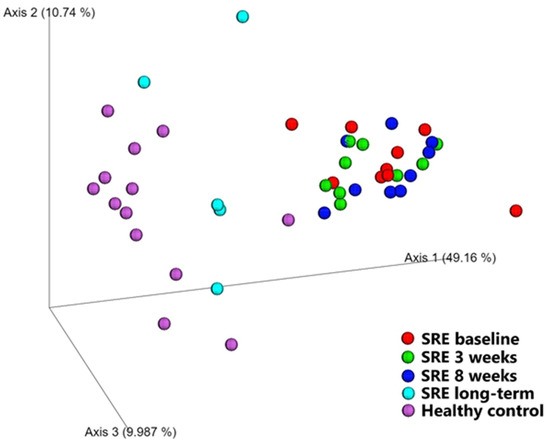 Beta diversity, a measurement of diversity between samples, was evaluated qualitatively (unweighted UniFrac) and quantitatively (weighted UniFrac, Figure 1) as shown in Table 2. Both metrics showed that the microbiome of dogs diagnosed with SRE before treatment was significantly different from that of healthy dogs (unweighted UniFrac p = 0.002; weighted UniFrac p < 0.001). No changes compared to baseline were observed in dogs with SRE after 3 and 8 weeks of treatment, and their microbiome remained significantly different from healthy controls (p = 0.001).