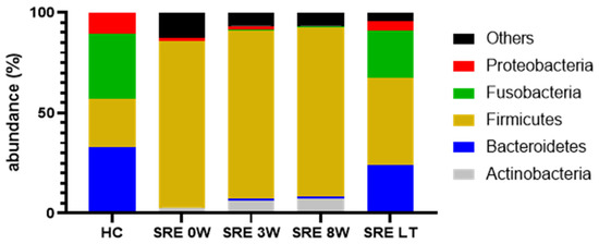 Fusobacteria is a major phylum in the fecal microbiome of healthy dogs [36], whose abundance was severely decreased in dogs with SRE (median 0.4% vs. 32.4% in HC, Figure 2), which is in agreement with the literature [1,13,30]. Some Fusobacterium species can produce butyrate, a SCFA, from protein, which could explain its role in the healthy microbiome of dogs. Fusobacterium remained significantly decreased after 8 weeks of treatment (median 0.6%); however, at the long-term follow-up, the median abundance of Fusobacterium was 20.3% and was no longer significantly different from HC.