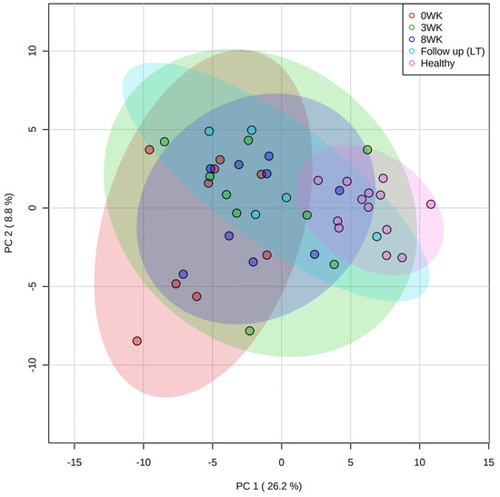 Fecal untargeted metabolomics. PCA plot showing healthy controls (pink dots) being tightly clustered, while samples from dogs with SRE are spread out at baseline (red dots). Shaded ellipses indicate the confidence intervals, with samples becoming progressively more clustered and closer to HC at 3 weeks (green dots), 8 weeks (blue dots), and long-term (LT, 1-year, cyan dots) follow up.