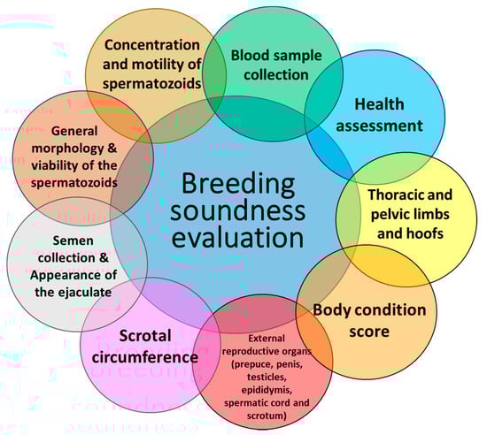 In addition to genetic evaluation and testing, an important tool to select potential breeding rams and ram lambs is through breeding soundness examinations (BSEs). A basic BSE consists of (1) a general clinical evaluation, including inspection of the mouth and teeth and determination of age of the animal (if records do not exist); (2) assessment of the general conformation of the thoracic and pelvic extremities; however special attention is given to the pelvic limbs and hoofs as well as mobility or locomotion scores; (3) evaluation and assessment of the body condition score []; (4) inspection of the external reproductive organs (prepuce, penis, testicles, epididymis and scrotum) by manual palpation and, in certain instances, by ultrasonographic evaluation of the testicular and epididymis tissue; (5) measurement of the scrotal size; (6) semen collection and evaluation, including the appearance of the ejaculate (volume, color and presence of abnormal secretions such as blood or pus), general morphology and viability of the spermatozoa (using histological dyes) and concentration and motility of the spermatozoa; (7) in some cases, collection of blood and fecal samples to diagnose/detect important diseases such as parasites and Brucella ovis. These aspects of the BSE are usually performed 2–4 weeks prior to the breeding season to determine the ability of the male to reproductively perform; however, in some cases, males have unsatisfactory values for one or more of the aspects of the BSE, and in this situation, a second BSE is recommended at least 2–3 weeks after the first. Figure 1 summarizes the various aspects of the BSE evaluation performed on mature rams (>2 years old) and ram lambs (≤1 year old).