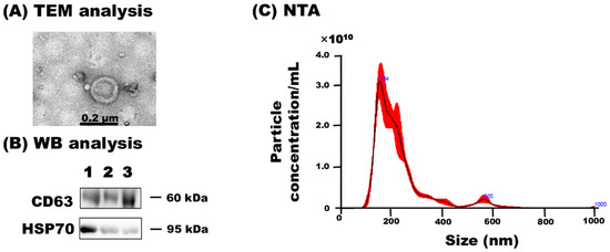 According to the Minimal Information for Studies of Extracellular Vesicles guidelines 2018 (MISEV2018) [3], the isolated milk sEVs were characterized biophysically, transmission electron microscopy (TEM), western blotting (WB), and nanoparticle tracking analysis (NTA) as described previously [15] with slight modifications. In brief, the milk sEVs pellet was diluted 10 times from its original concentration using distilled water (DW) and applied to glow-discharged carbon support films on copper grids. The milk sEVs pellet solution was stained by using 2% uranyl acetate and dried. The milk sEVs morphology was visualized under an electron microscope, JEM-2100F (JEOL, Tokyo, Japan) at 200 kV. In WB analysis, the primary antibodies, anti-CD63 (1:400, M-13, SC-31214, Santa Cruz Biotechnology, Santa Cruz, CA, USA) and anti-HSP70 (1:100, N27F3-4, Enzo Life Science, Farmingdale, NY, USA) were used and incubated the membrane at room temperature (RT) for 1 h followed by being washed thrice.