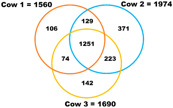 Comprehensive proteomic analysis by nanoLC-MS/MS revealed a total of 2225 proteins in milk sEVs from the three cows (Supplementary Materials Table S1). The identified proteins in each of the milk sEVs samples from cows 1, 2, and 3 were 1560, 1974, and 1690, respectively (Figure 2). Raw data of proteomic analysis of milk sEVs from cows 1, 2, and 3 were deposited and available in the Mendeley data repository (Mendeley Data, V1, doi: 10.17632/7c2ddgwcgt.1, accessed on 7 October 2020). A total of 1251 proteins were commonly identified in the milk sEVs from the three cows. After comparing the identified proteins among the three cows, it was found that the number of non-overlapping proteins in cows 1, 2, and 3 were 106, 371, and 142, respectively. The current study revealed different numbers of proteins in milk sEVs from the three cows, indicating the variability of milk sEVs biogenesis depending on the individual.
