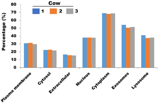 GO analysis was performed to reveal the biological phenomena associated with the identified proteins in milk sEVs. Comparative cellular component analysis was carried out to demonstrate the subcellular derivation of the identified proteins in milk sEVs (Figure 4). The milk sEVs from cows 1, 2, and 3 contained a high percentage of proteins derived from the cytoplasm, exosomes (sEVs), and lysosomes, indicating the sEVs enrichment concept. Comparative proteomic analysis revealed 1251 common proteins among cows 1, 2, and 3 (Figure 2). As expected, the milk from all three cows was highly enriched with common milk proteins such as butyrophilin, lactadherin, fatty acid synthase, alpha-lactalbumin, and lactotransferrin. The presence of these proteins indicated the reliability and reproducibility of the current study method for milk sEVs enrichment derived from late-stage lactating cows.