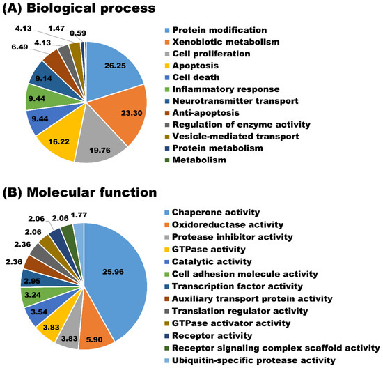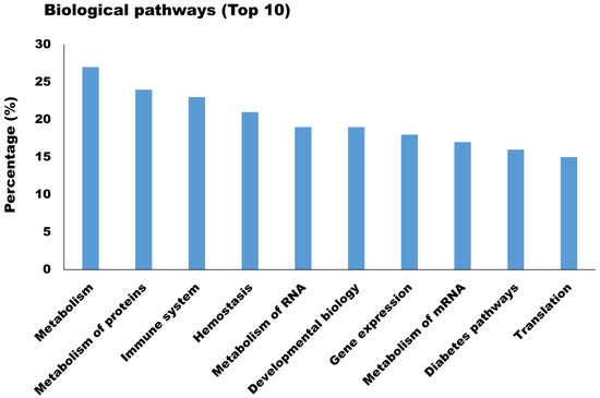 The newly identified proteins were involved in a broad range of biological processes such as protein modification (26.25%), xenobiotic metabolism (23.30%), cell proliferation (19.76%), and apoptosis (16.22%) (Figure 5A). As for the molecular function, the majority of newly identified proteins appeared to participate in chaperone activity (25.96%), oxidoreductase activity (5.90%), and protease inhibitor activity (3.83%) (Figure 5B). Biological processes and molecular functions are extensively utilized because they provide a broad data overview, but their capacity to uncover individual signaling pathways is restricted. Therefore, biological pathway analysis of newly identified proteins in milk sEVs was carried out. The biological pathway analysis revealed that the newly identified proteins in milk sEVs mostly participated in metabolism, metabolism of proteins, immune system, and homeostasis (Figure 6). Biological pathway analysis revealed the potential connections between newly identified proteins and the pathways that connect them to biological processes and molecular functions.