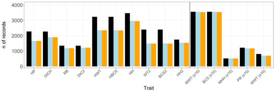 Original size of dataset (black bar) and number (n) of records after animals with missing contemporary group (CG) and/or age of animal or dam information (blue bar) as well as outliers (orange bar) have been removed from the dataset; n of records were divided by 10 for traits presented to the right of the divide; HP = pregnancy rate of 15-month-old heifers; DtCH = days to conception in 15-month-old heifers; RB = rebreeding performance in 2-year-old cows; DtC2 = days to conception in 2-year-old cows; HWT = live weight of 15-month-old heifers; HBCS = body condition score of 15-month-old heifers; HH = hip height of 15-month-old heifers; WT2 = live weight of 2-year-old cows; BCS2 = body condition score of 2-year-old cows; HH2 = hip height of 2-year-old cows; MWT = mature cow live weight; BCS = body condition score of mature cows; MHH = hip height of mature cows; PR = pregnancy rate of mature cows; WWT = weaning weight of calves.