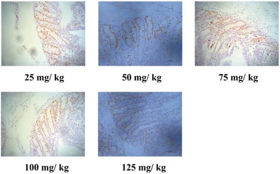 The slides were dried, dewaxed, rehydrated, and treated with 3% hydrogen peroxide (H2O2) in methanol for 10 min. Antigen retrieval was performed by boiling the slides twice in a sodium citrate buffer (0.01 mol/L, pH 6.0). A 5% bovine serum albumin (BSA; Boster Biological Technology Co. Ltd, Wuhan, China) was used in a 1:10 dilution during a 30 min incubation period at 37 °C. There was a two-hour incubation period with the Ki67 antibody (Abcam, ab15580; 1:800 dilution) at 37 °C. Sections were treated with a goat anti-rabbit IgG secondary antibody (ZSGB-BIO, Beijing, China) for one hour at 37 °C. With the exception of the blocking step, at every step, washing was completed thrice in PBS for 5 min. Positive cells were observed with a diaminobenzidine (DAB) Kit (ZSGB-BIO, Beijing, China), stained with hematoxylin, and made into permanent pieces. A total of 15 microscopic fields per sample were captured using a light microscope under 20× magnification (Leica DM3000, Leica Microsystems, Wetzlar, Germany). The number of Ki67-positive cells, at least 30 well-oriented complete crypts per sample was counted manually for analysis [].