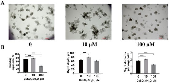 In vitro intestinal stem cell activity obtained from piglets treated with 10 and 100 μmol/L CuSO4·5H2O is presented in Figure 2. We found that 10 μmol/L CuSO4·5H2O significantly increased (p < 0.001) organoid budding efficiency, crypt depth, and crypts per organoid compared to the control pigs (Figure 2B). However, 100 μmol/L CuSO4·5H2O inhibited (p < 0.001) the organoid budding efficiency and the crypts per organoid.