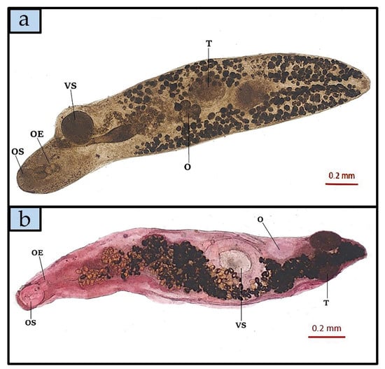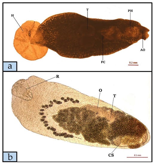 - Yamaguti, S. Digenetic Trematodes of Hawaiian Fishes; Interscience Publishers: New York, NY, USA, 1970. [Google Scholar]